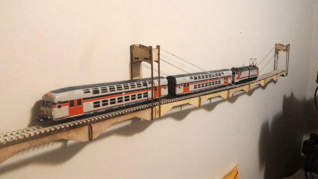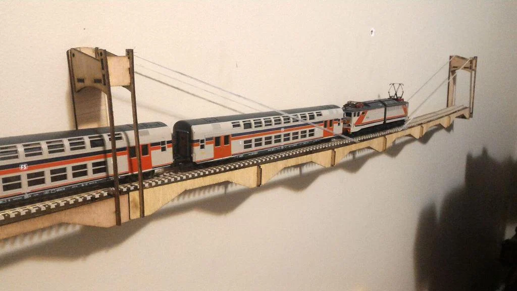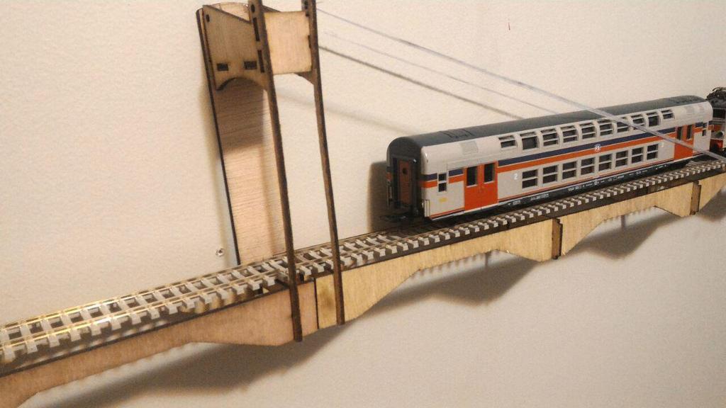 Esta ponte cortada a laser em escala HO foi projetada para ser fixada na parede com o mínimo de parafusos. Isso proporciona um recurso decorativo que permite a montagem do Flextack em escala HO na parede.